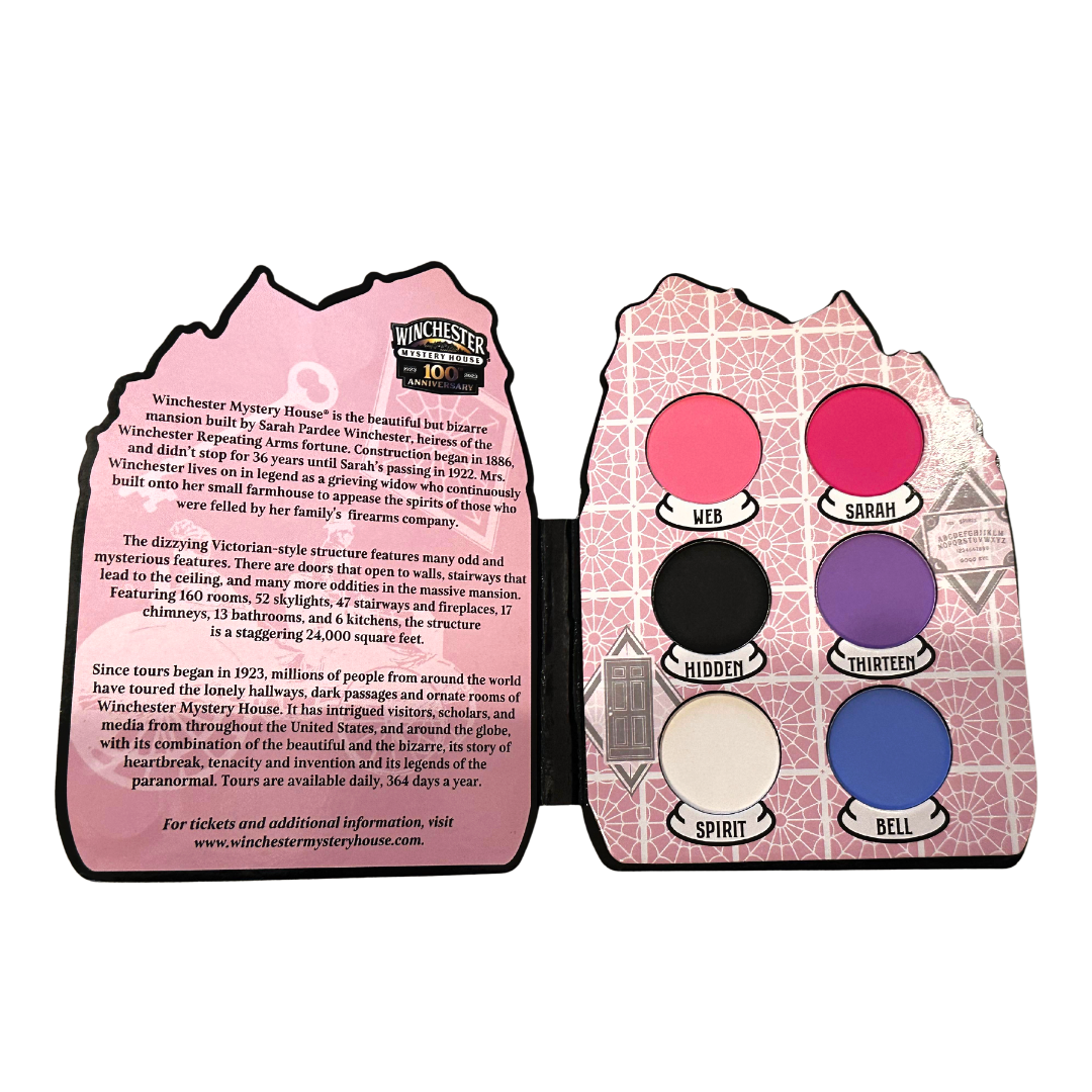 ABOUT THE ARTWORK: The Winchester Crystal Palette features vibrant and bright colors in a 3 finishes, Matte, Shimmer & Satin. Made from natural minerals, it’s great for sensitive skin. Customers can use the bold, accent and highlighter colors and feel magickal while wearing them. What many consider to be the heart of the mansion, the séance room was once the very private and off-limits room to everyone but Sarah Winchester herself. Legends say that nearby residents heard the bell tower (located outside of the séance room) at midnight and again at 2am. Was this to summon and release spirits to communicate with them? There is one entrance to this room, and three exits. One exit is through the entrance door, another leads to an 8-foot drop into the kitchen below, and the final is a one-way door that resembles a secret passageway. These 4 entrances are why this palette has 4 shades. You’ll have to visit the house for yourself what lies on the other side.